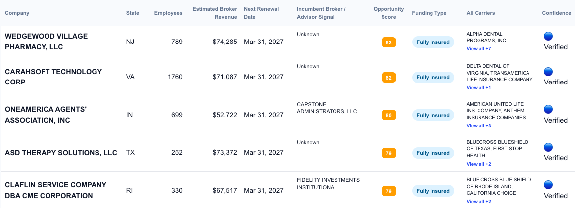 See real companies, estimated broker revenue, renewal timing, funding type, carriers, and AI-guided next steps in one revenue-focused view.